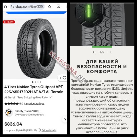 Комплект шин NOKIAN OUTPOST APT. Дата выпуска 45-я неделя 2024 года (конец года). Размер 225/65/R17 СОСТОЯНИЕ НОВЫХ! Шины ПРЕМИУМ сегмента для комфортной и уверенной эксплуатации в любых дорожных условиях с увеличенным ресурсом и увеличенной топливной экономичностью. Заводская гарантия - 105 тыс. км. (см. фото) Цена за комплект данных шин в магазине - 800 $ (см. фото). Подробную информацию о данных шинах можно прочитать на фото. В объявлении указана цена за комплект из 4 единиц